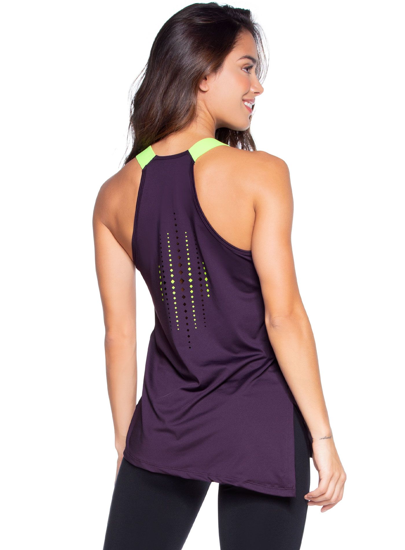 Blusa deportiva sin mangas con silueta amplia, abertura lateral, tiras de soporte elásticas en contraste y cortes laser en espalda que compaginan con la prenda.