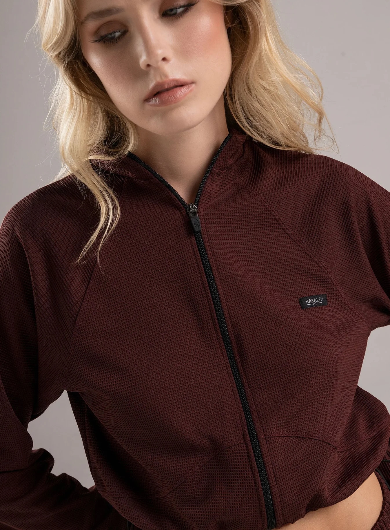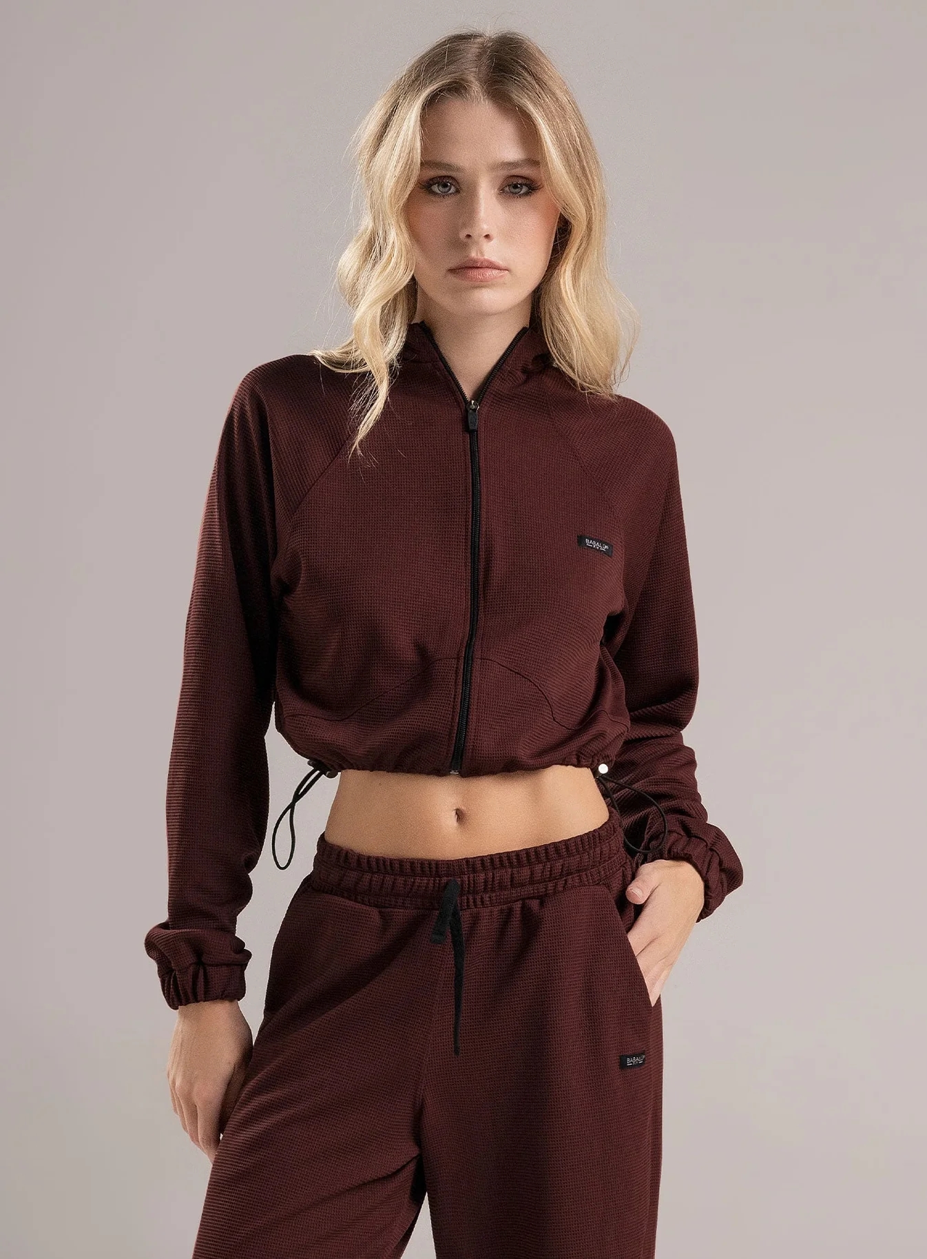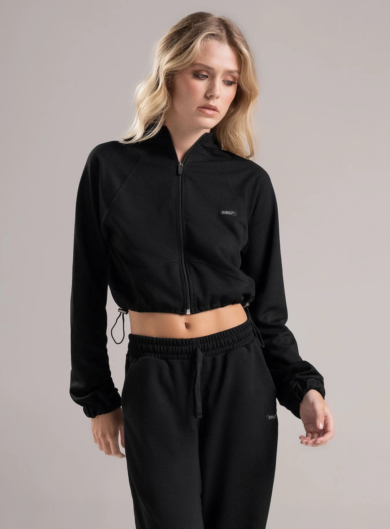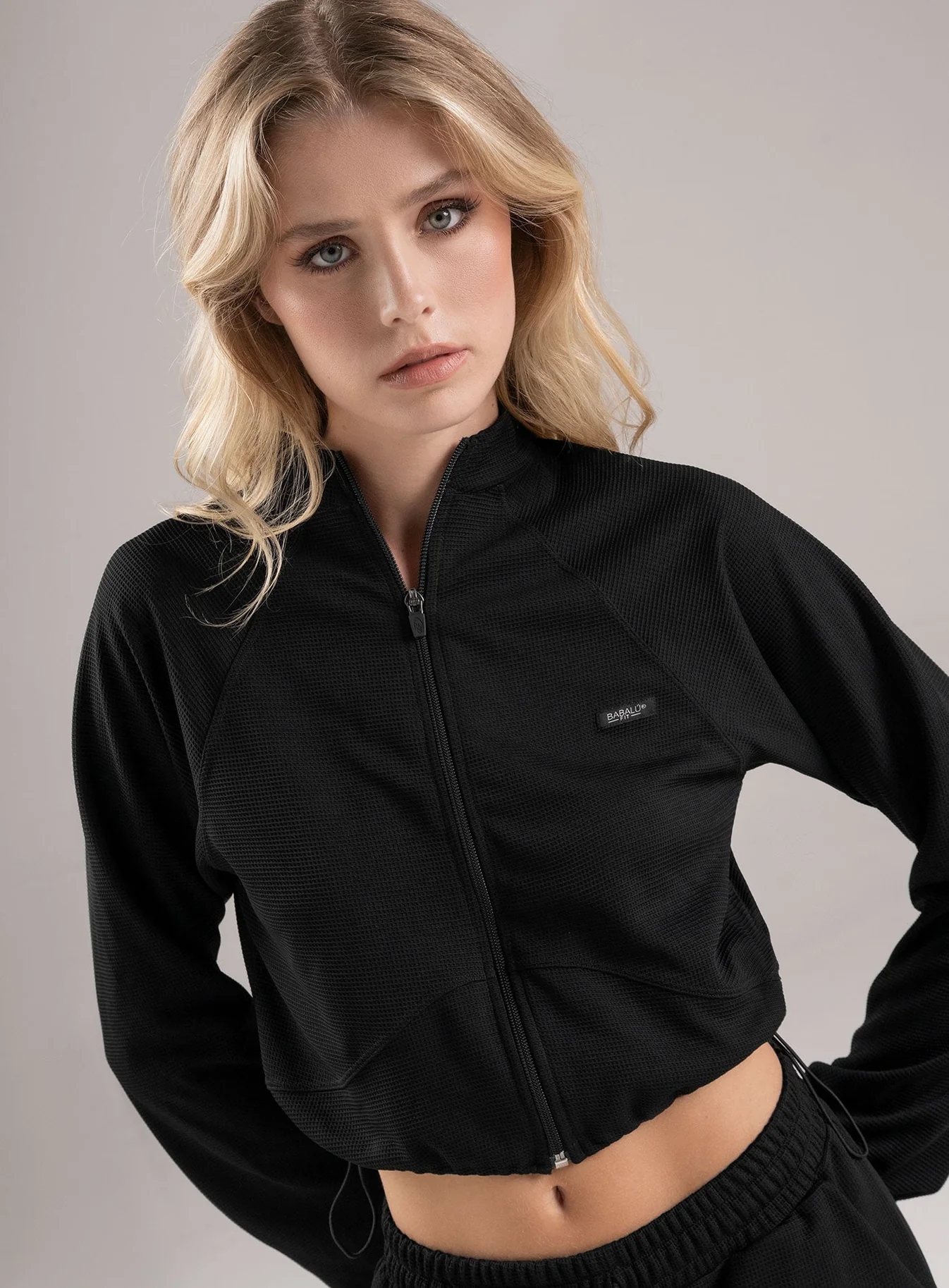 Chaqueta deportiva dama estilo casual en tela sin elongación con una superficie en textura «galleta». incluye cordón elástico con terminales niquelados en el ruedo para dar ajuste al gusto. es ideal para paseos al aire libre o construir un look fresco y con estilo.