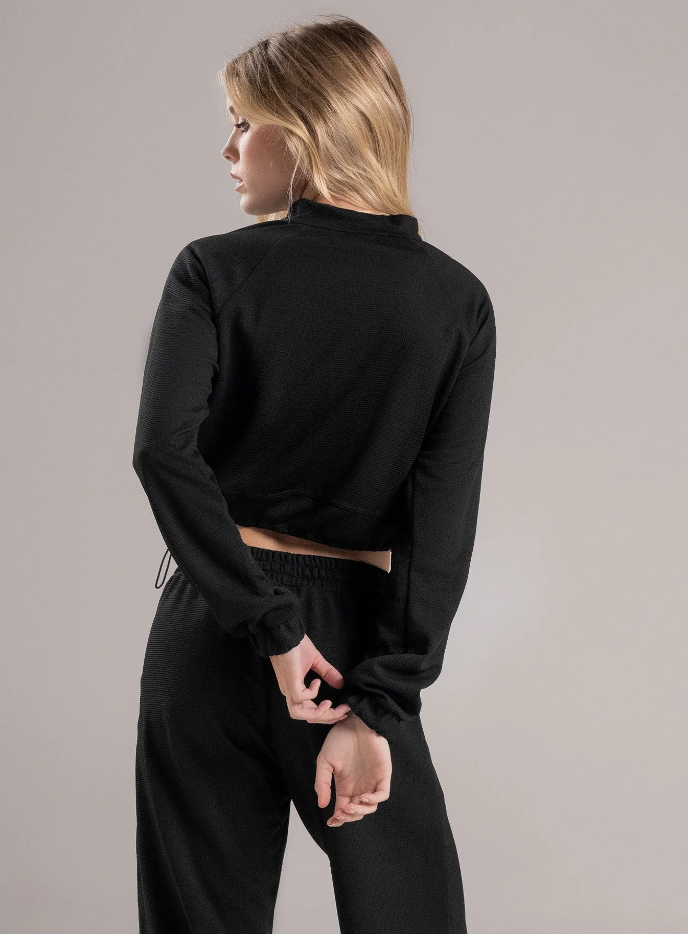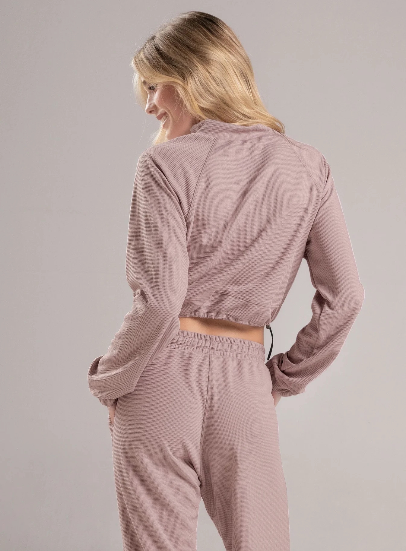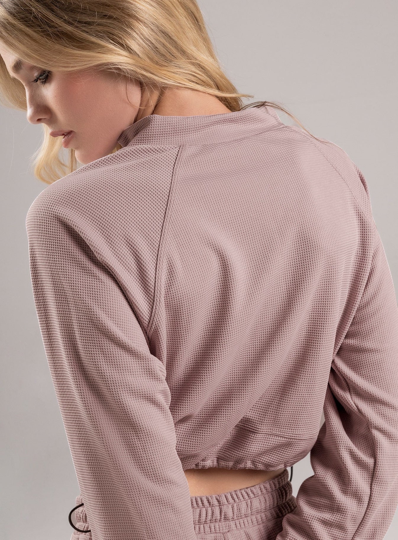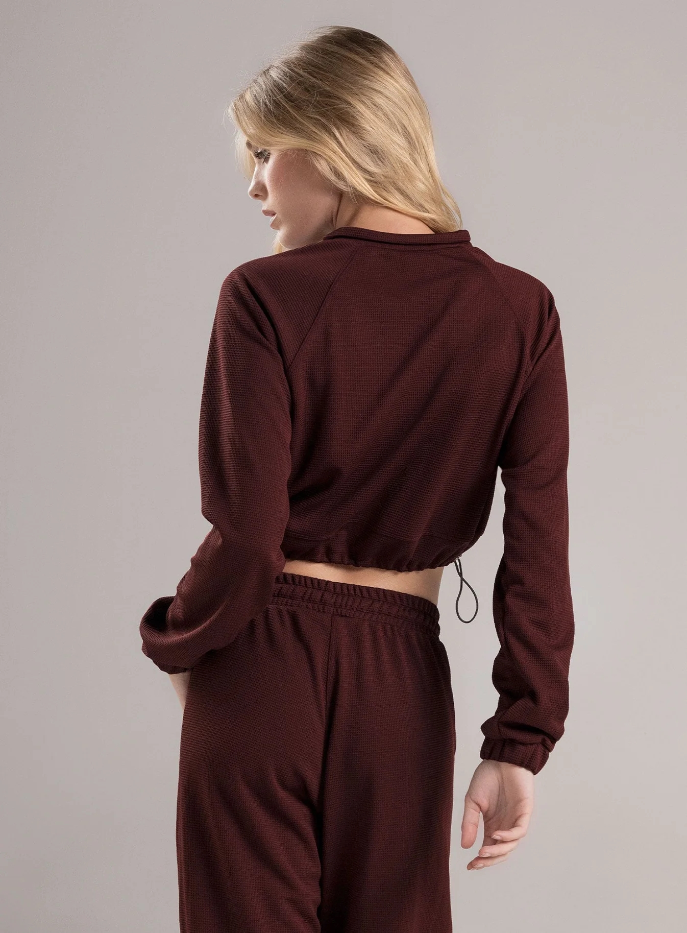 Chaqueta deportiva dama estilo casual en tela sin elongación con una superficie en textura «galleta». incluye cordón elástico con terminales niquelados en el ruedo para dar ajuste al gusto. es ideal para paseos al aire libre o construir un look fresco y con estilo.