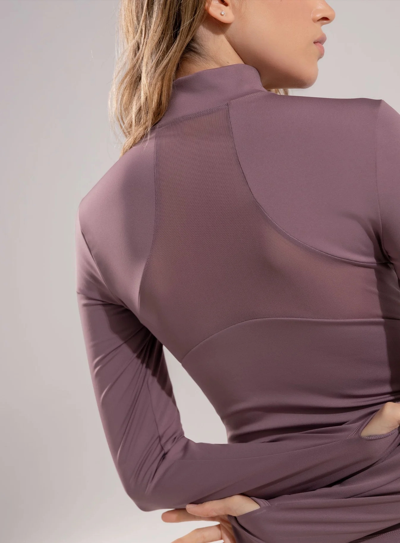 Chaqueta deportiva dama liviana de silueta ajustada con apertura frontal completa mediante cierre, cuello alto y puños extendidos para aberturas en pulgares, en la parte posterior, se destacan cortes curvos y cruzados que combinan funcionalidad, comodidad y diseño.