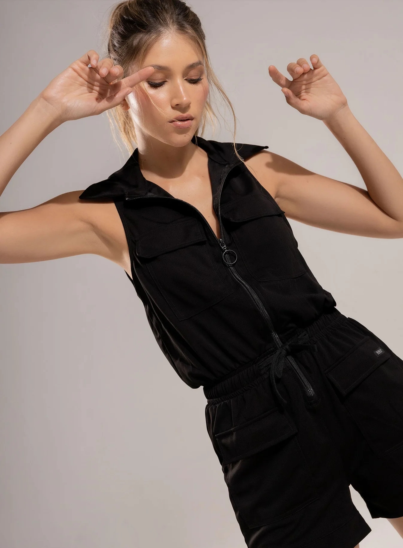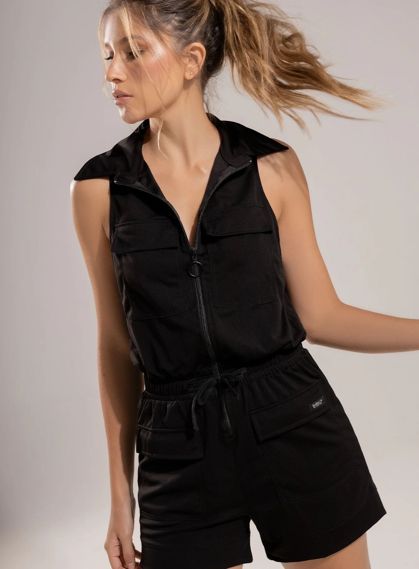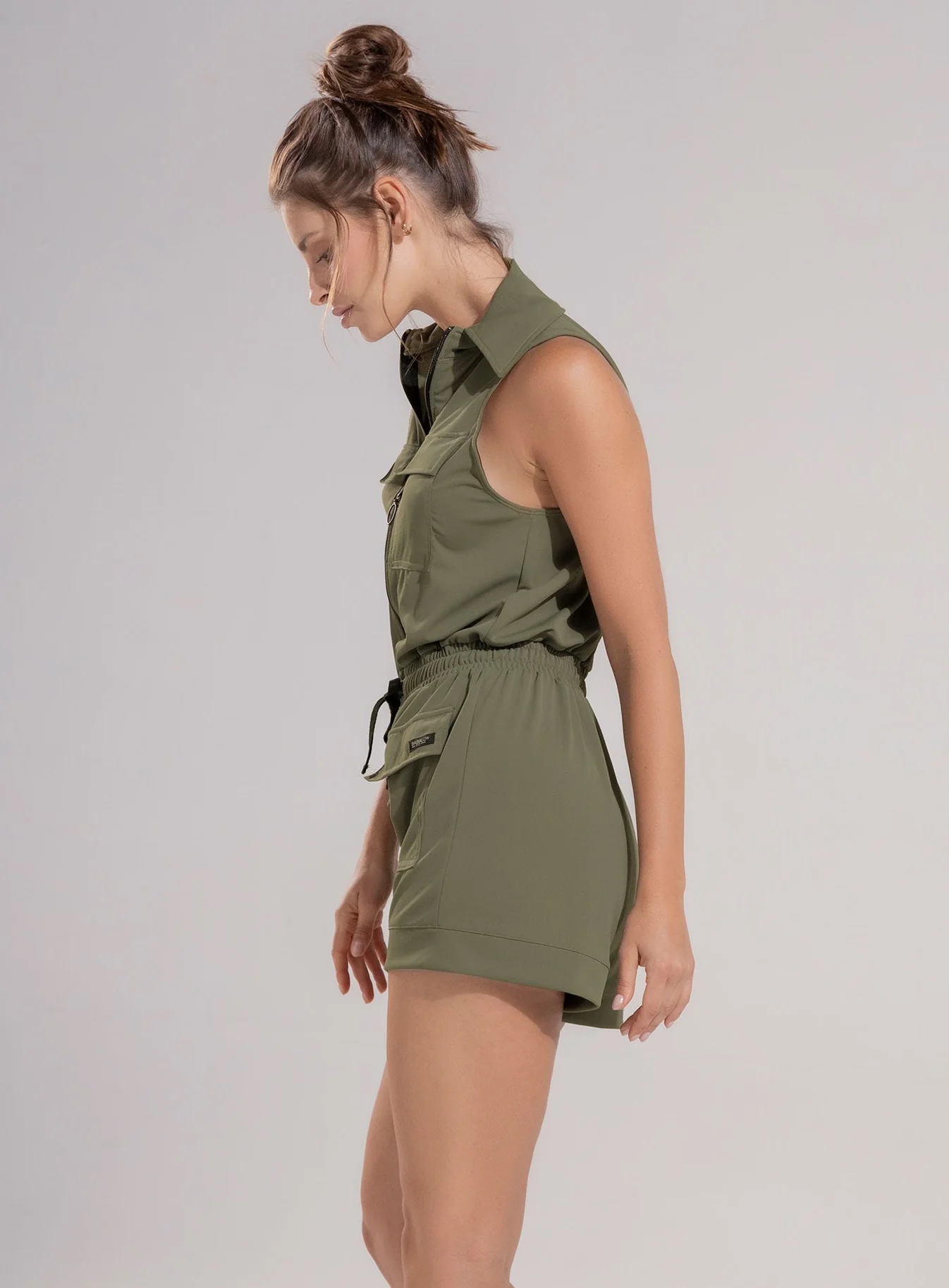 Enterizo deportivo dama de manga sisa con cuello camisero en tela sin elongación estilo casual, bolsillos funcionales con tapa, cordón para ajustar a la medida y elástico interno para mejor ajuste, su diseño casual y fresco lo hace ideal para recrear looks frescos y a la moda.