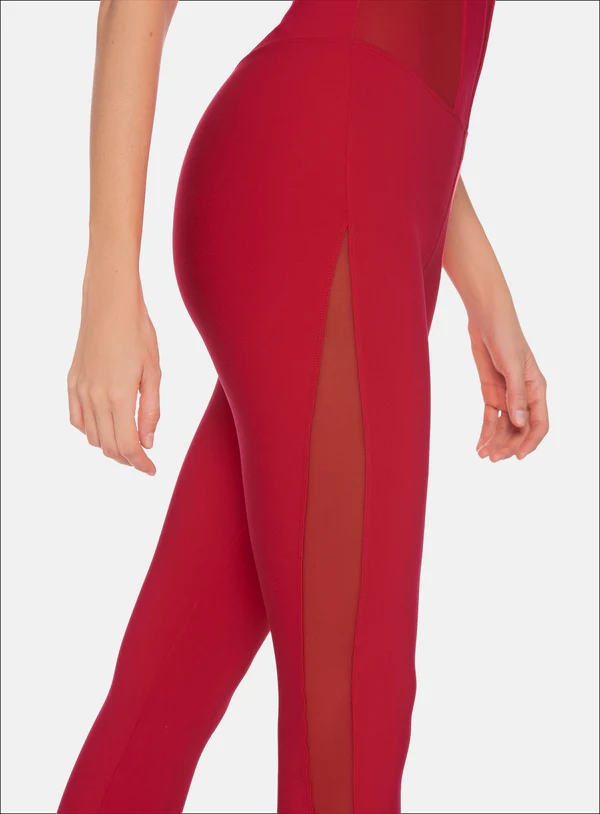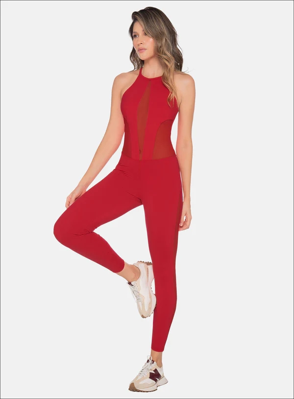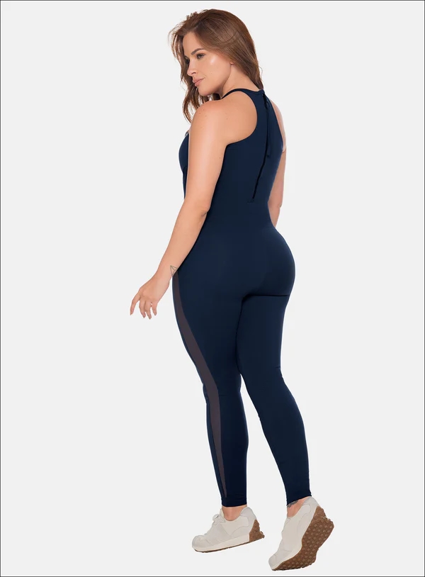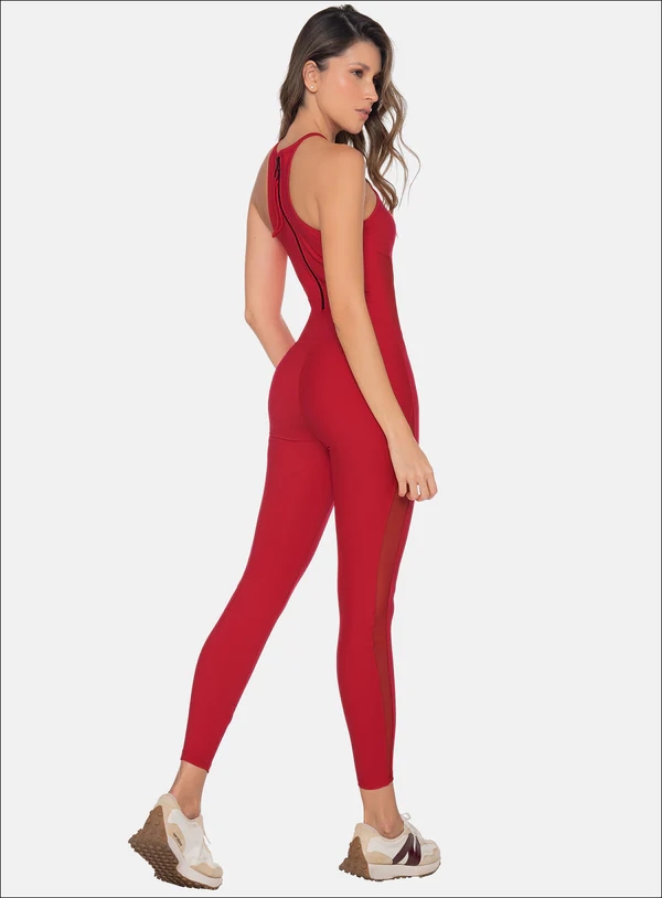 ENTERIZO DEPORTIVO LARGO CON CORTES EN TELA SEMI TRANSPARENTE Y CIERRE CON ARGOLLA DECORATIVA EN LA PARTE DE LA ESPALDA.
