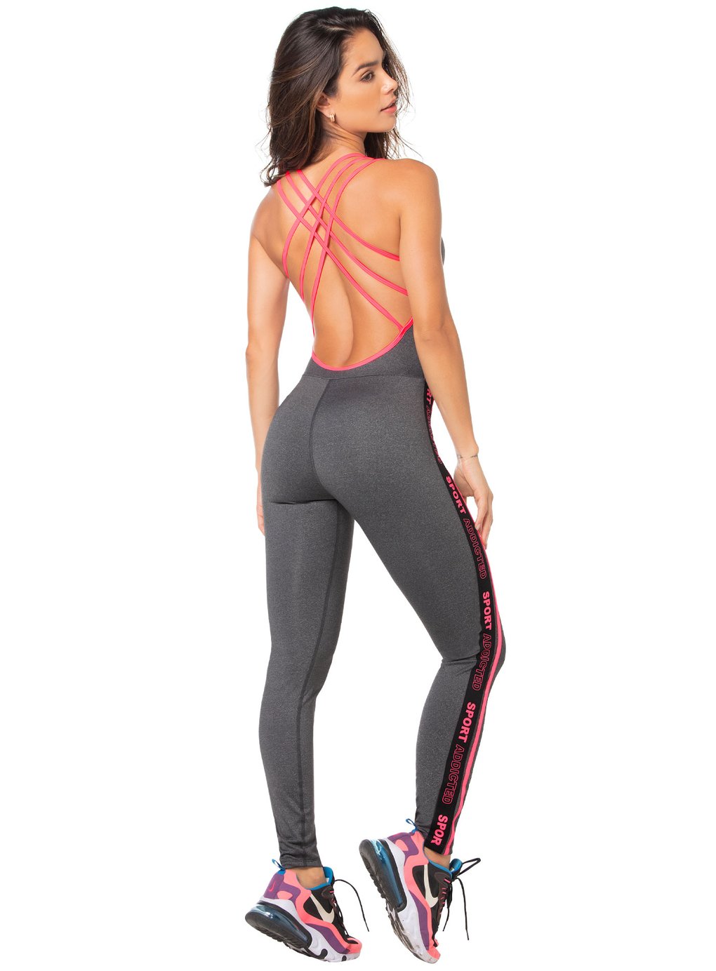 Enterizo deportivo con silueta ajustada tipo talle largo, escote en espalda, sesgos en contraste y elástico estampado en laterales.