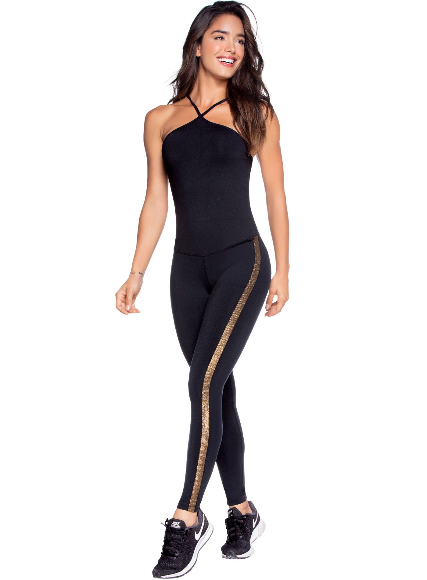 Enterizo deportivo con silueta ajustada tipo talle largo y escote en espalda. Tela con diseño Lurex.