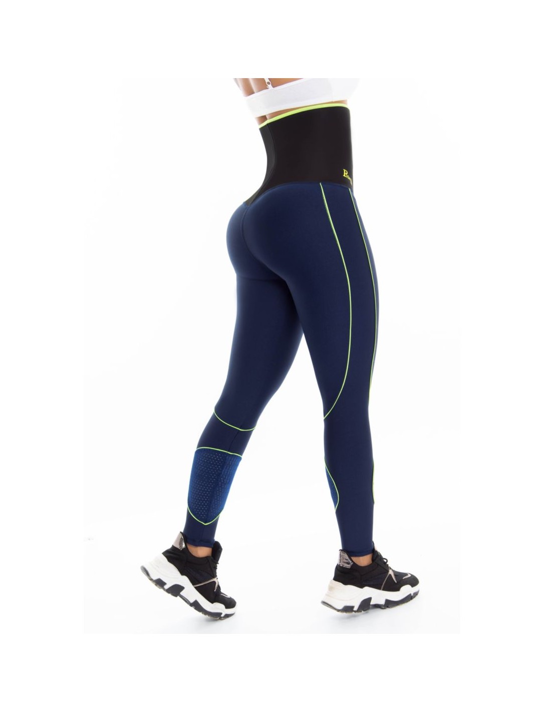 Leggins con faja incorporada control abdominal en powernet que es una tela elástica elaborada en mezcla de poliamida y elastano. Las prendas elaboradas con éste material tienen una mayor compresión que las fabricadas solamente con Lycra debido a su compresión gradual, el Powernet es una prenda que sirve para moldear y modelar su cuerpo con su uso constante